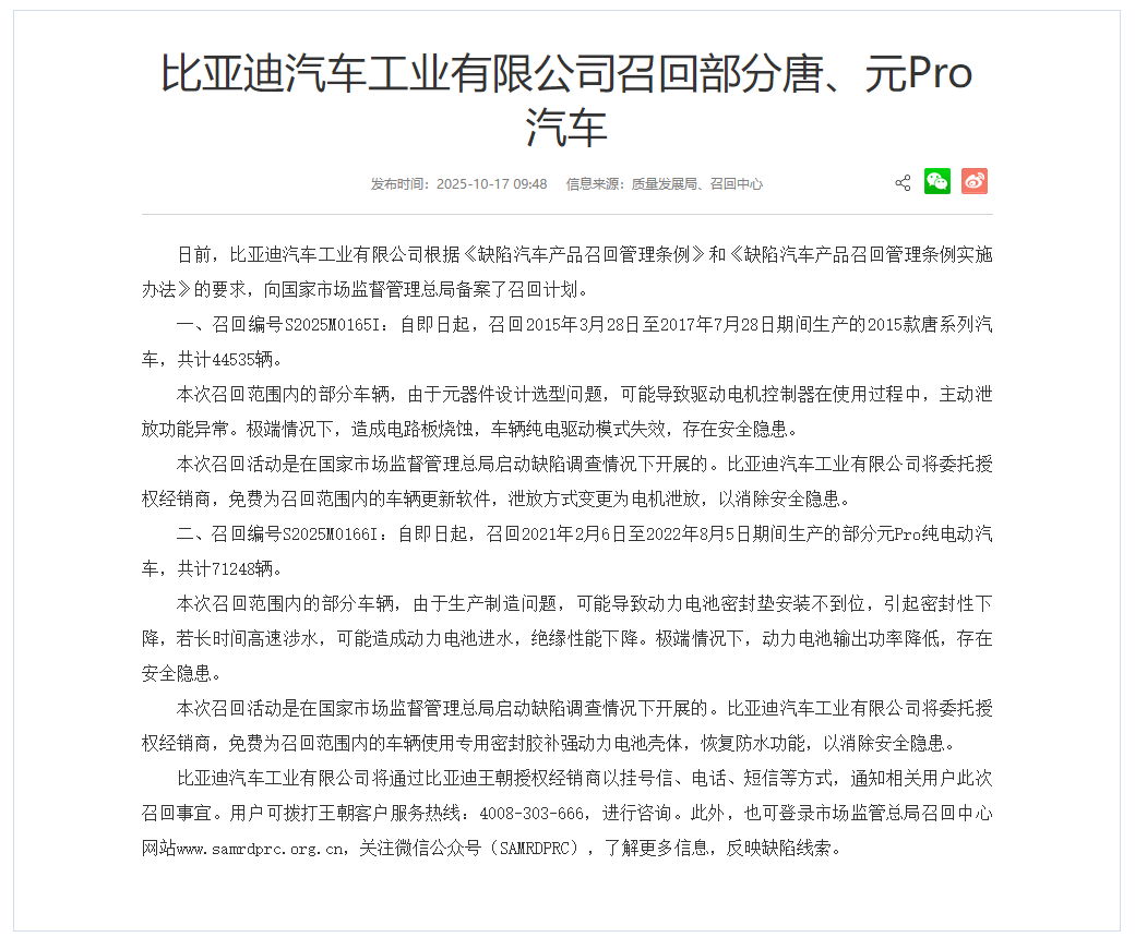 二、召回编号S2025M0166I:自即日起,召回2021年2月6日至2022年8月5日期间生产的部分元Pro纯电动汽车,共计71248辆。