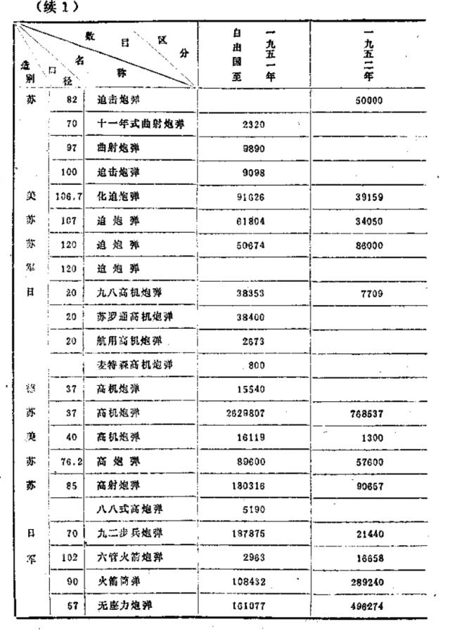 ▲"自出国至停战三年来过轨弹药"综合统计数目表一览,注意这只是部分弹药,并不是全部。从表中数据来看,志愿军火箭筒弹药及无后坐力炮弹药获取最多的年份是在 1952 年,分别为 289240 发、496274 发
