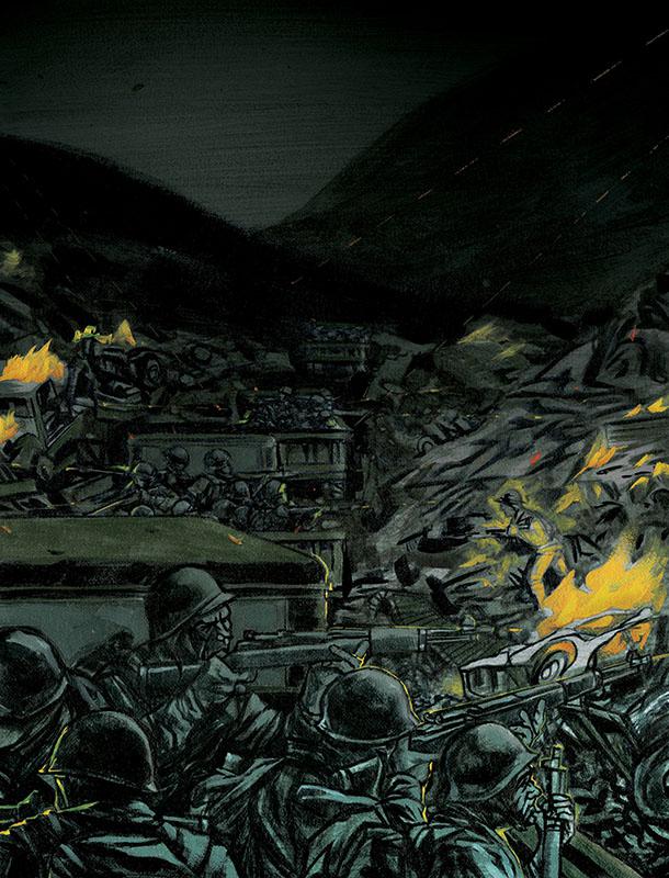 ▲(彩绘)原图注:1950 年 11 月 30 日,当美军第 2 步兵师在朝鲜军隅里以南地区穿越长达七英里的 " 炮火走廊 " 时,志愿军官兵趁着夜色向其行军队伍发起白刃突击
