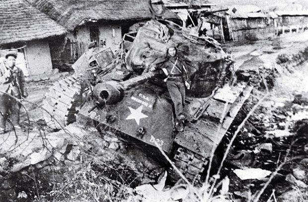 ▲同被毁 M26 "潘兴"坦克合影的志愿军官兵