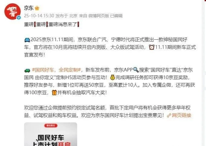 这种场景还真不是胡编,前两天,微博上那条关于“双十一期间京东联手广汽和宁德搞新车”的热搜一下子就把大家搅动起来了。关注家用电车的朋友都懂,这个价格放在现在,满打满算就是刚好戳中绝大多数家庭的购车“命门”。而且,很多人也明白,类似背景的大佬联手入局,不只是喊口号,噱头可不是虚的。